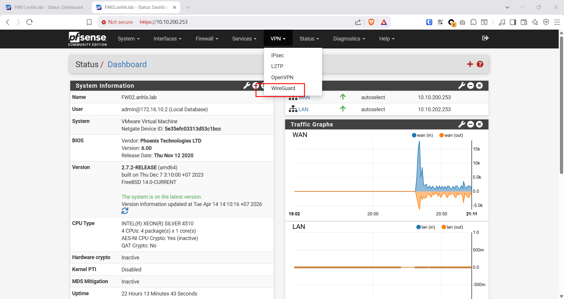 Lưu ý mô hình lab: Trong lab, VLAN 200 giả lập Internet nên cả 2 FW đều có IP trên cùng subnet. Trong thực tế, FW01 sẽ có private IP từ ISP (NAT) và FW02 sẽ có Public IP thật trên cloud. Cấu hình WireGuard giữ nguyên — chỉ thay IP endpoint của FW02 thành Public IP thật.