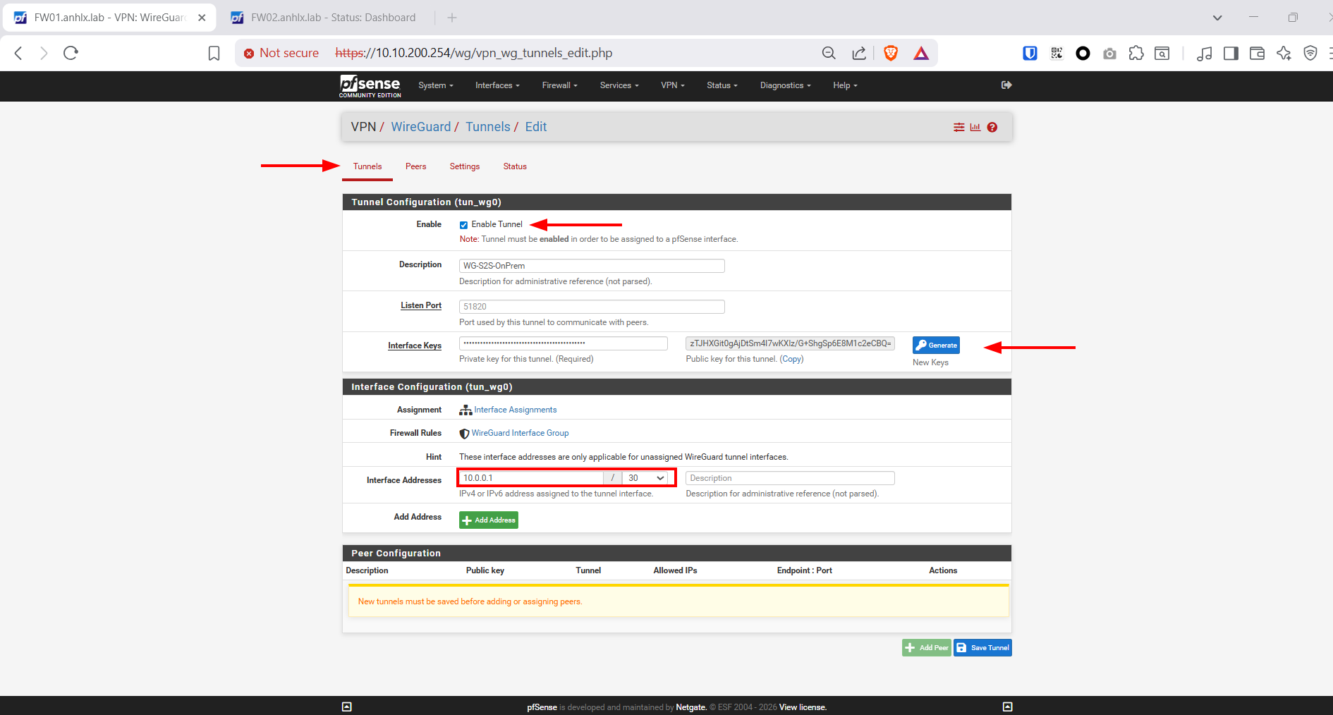 Nhấn Save Tunnel → Copy Public Key của FW01 ra notepad để dùng cho bước cấu hình peer trên FW02.
