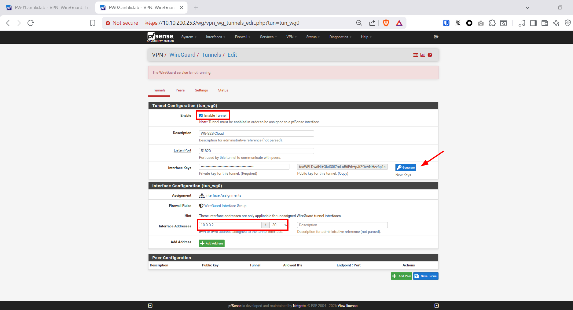 Nhấn Save Tunnel → Copy Public Key của FW02 để paste vào cấu hình peer trên FW01 (bước 4.2).