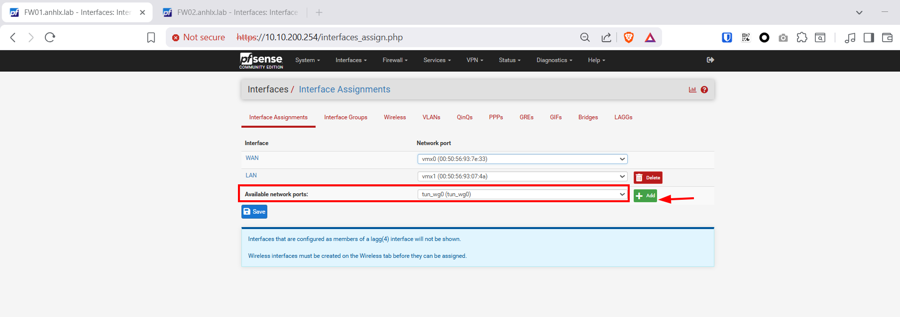 - Ở Available network ports, chọn tun_wg0 → Nhấn Add