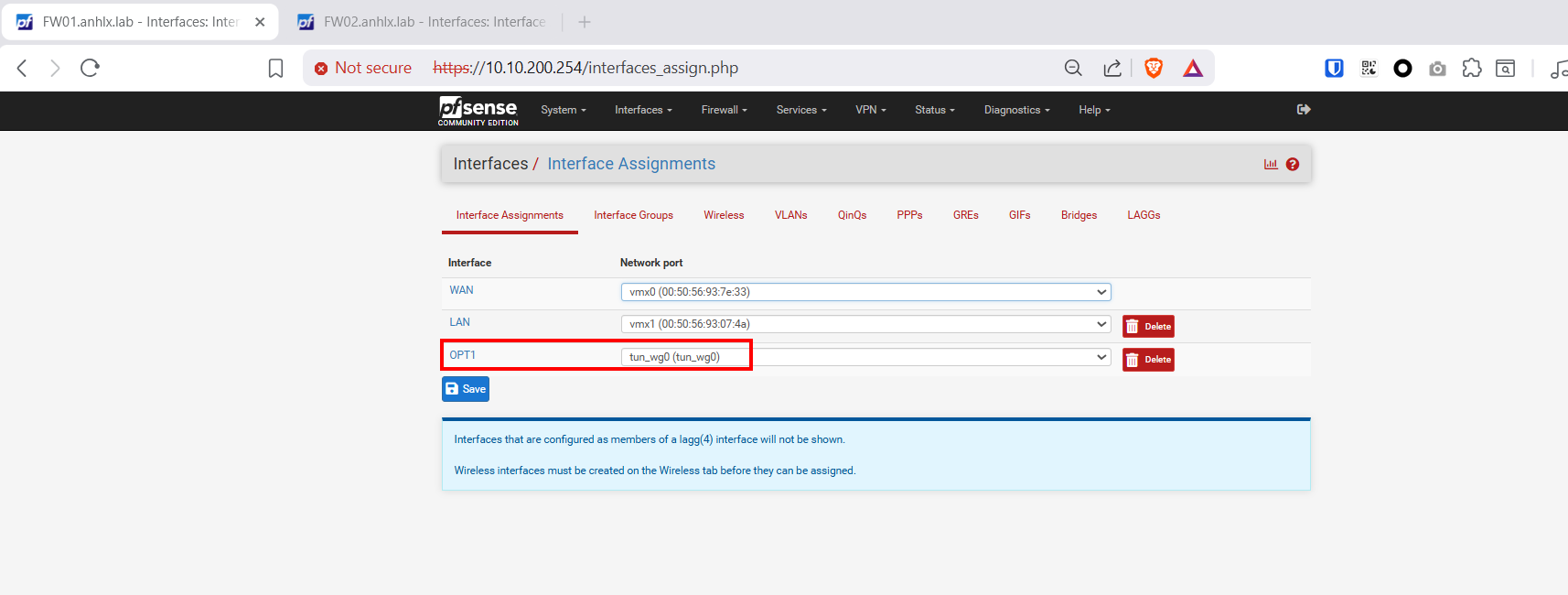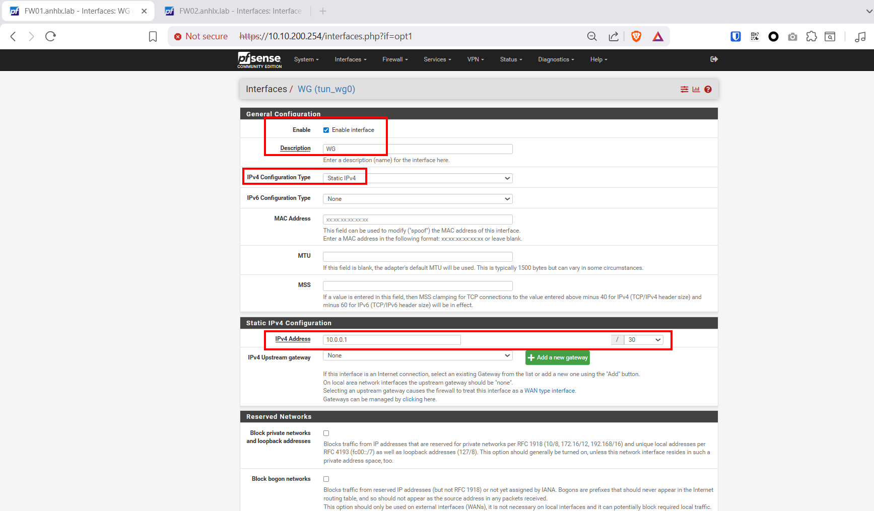 | FW01 | WG (tun_wg0) | 10.0.0.1 | /30 | WireGuard Tunnel — Initiator |