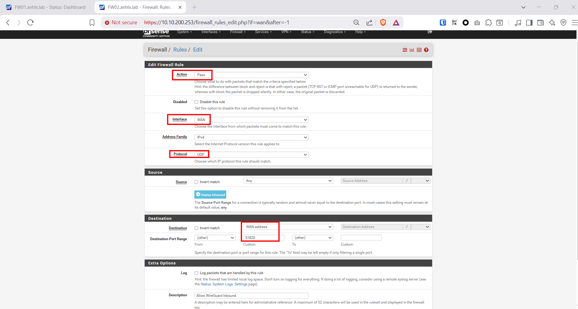 Chỉ cần tạo trên FW02 (Cloud) — vì FW02 là listener, nhận kết nối inbound trên port 51820. FW01 (on-prem) không cần WAN rule cho WireGuard vì traffic là outbound (FW01 chủ động kết nối ra ngoài).