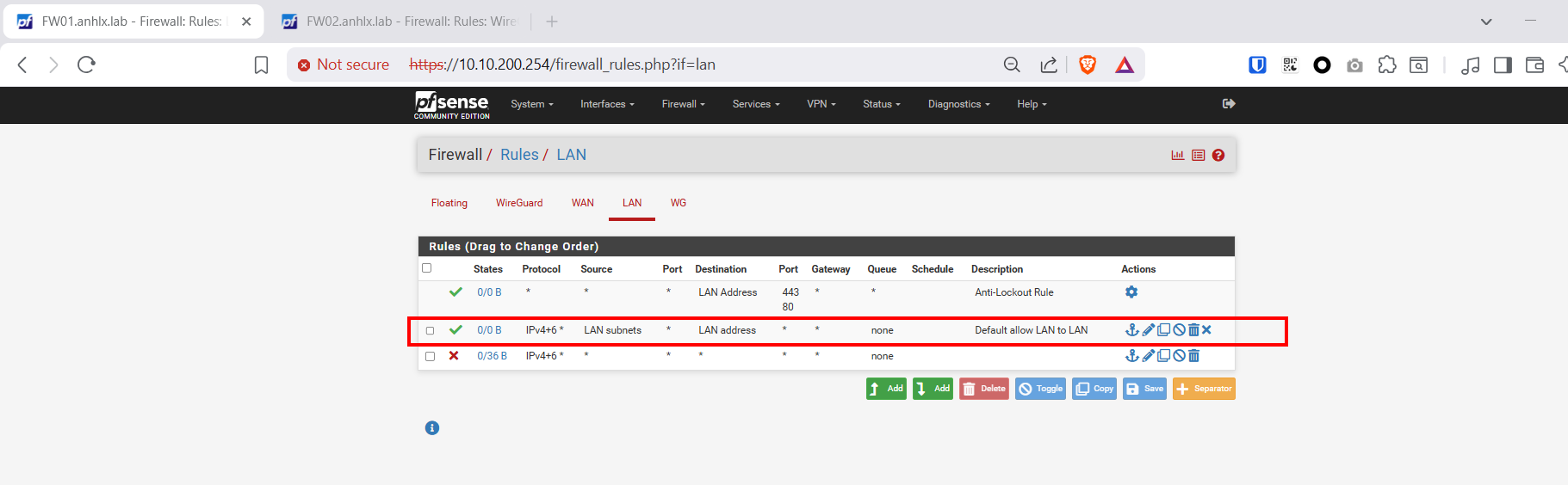 LAN rules mặc định trên cả 2 pfSense đang có: