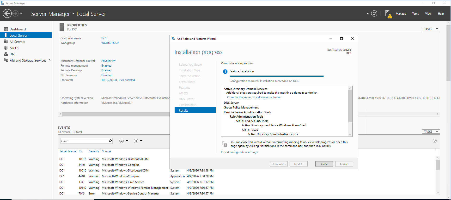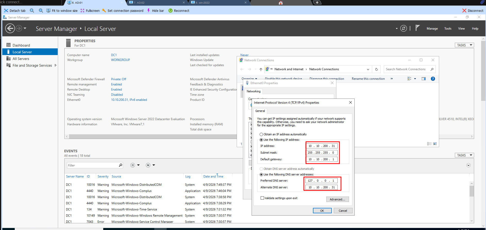 | Domain Controller 1 | DC1 | 10.10.200.31 | 255.255.255.0 | 10.10.200.1 | 127.0.0.1, 10.10.200.32 |