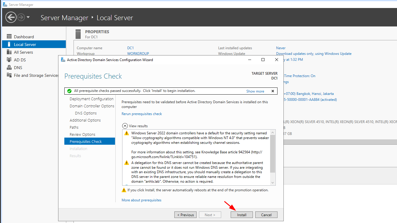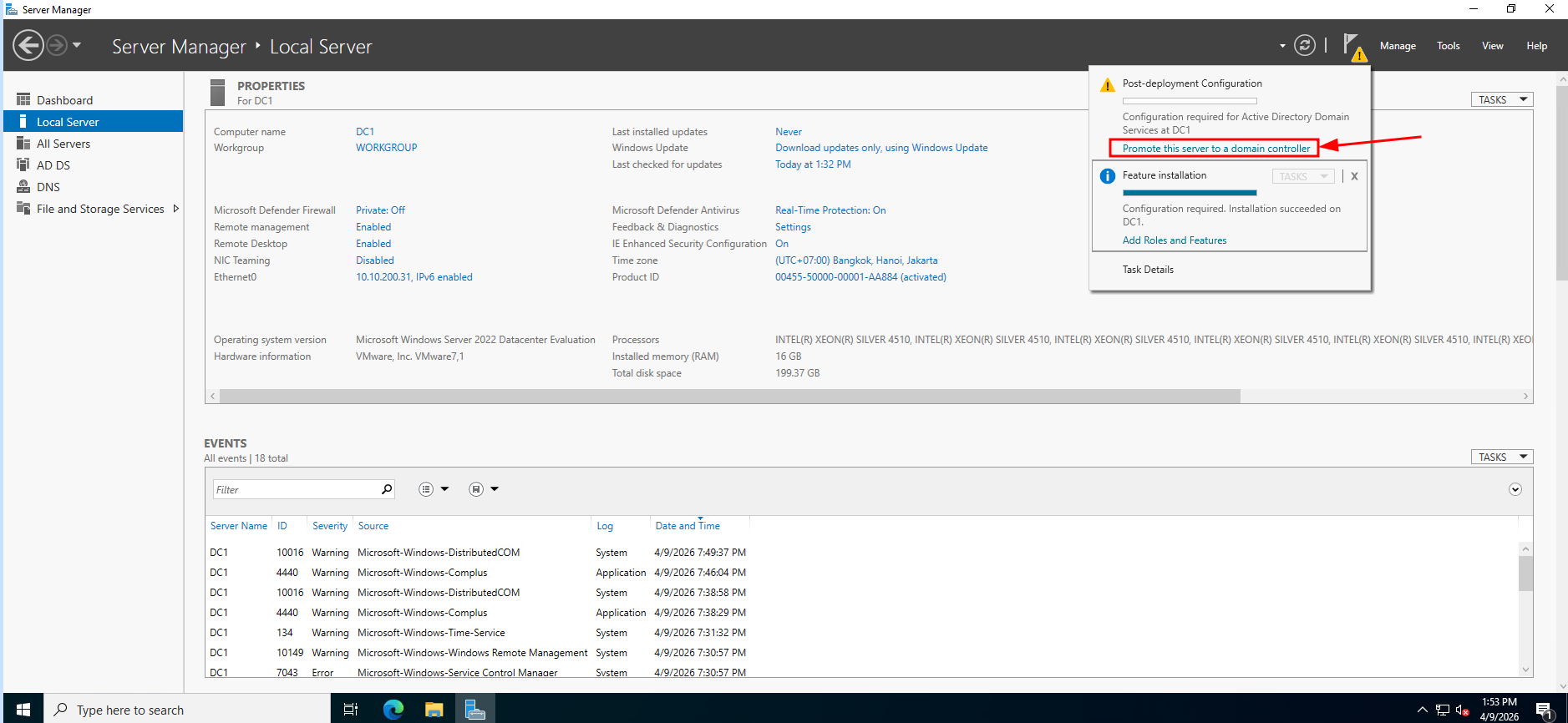 Sau khi cài xong role, click Promote this server to a domain controller trong Server Manager: