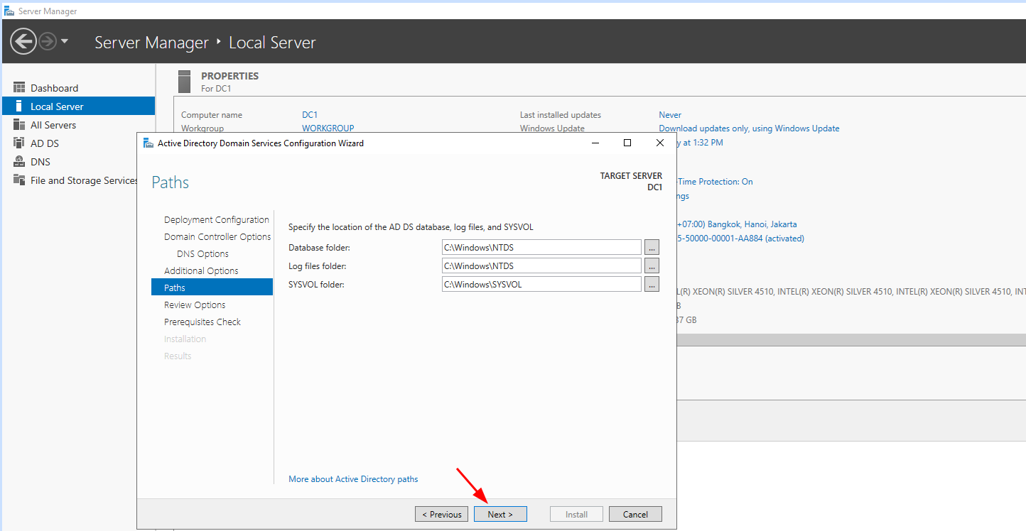 - Giữ mặc định đường dẫn Database, Log, SYSVOL