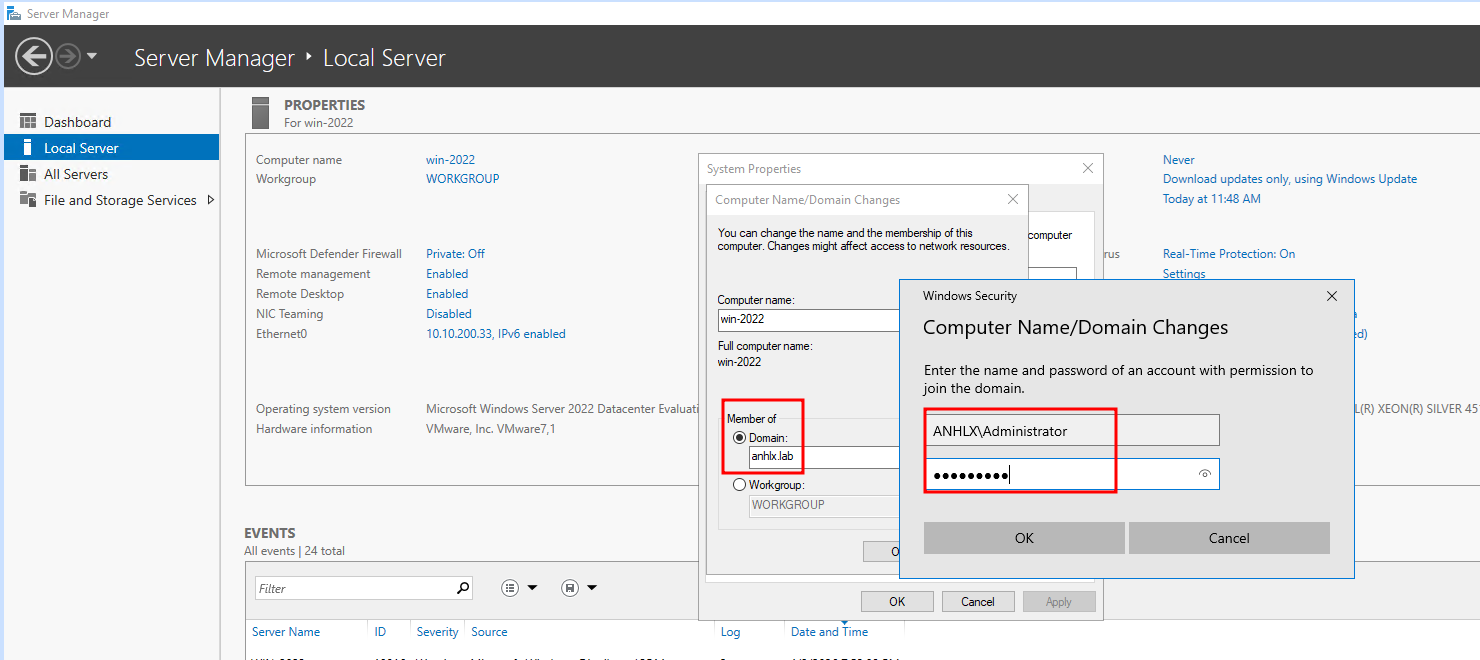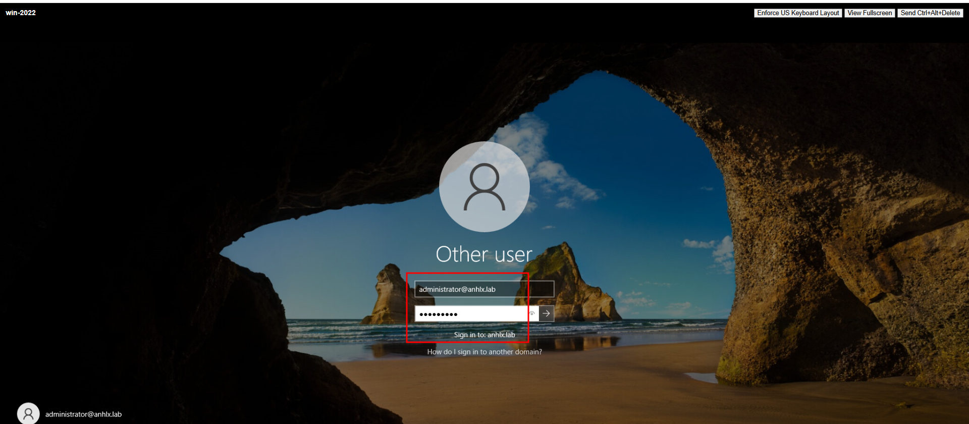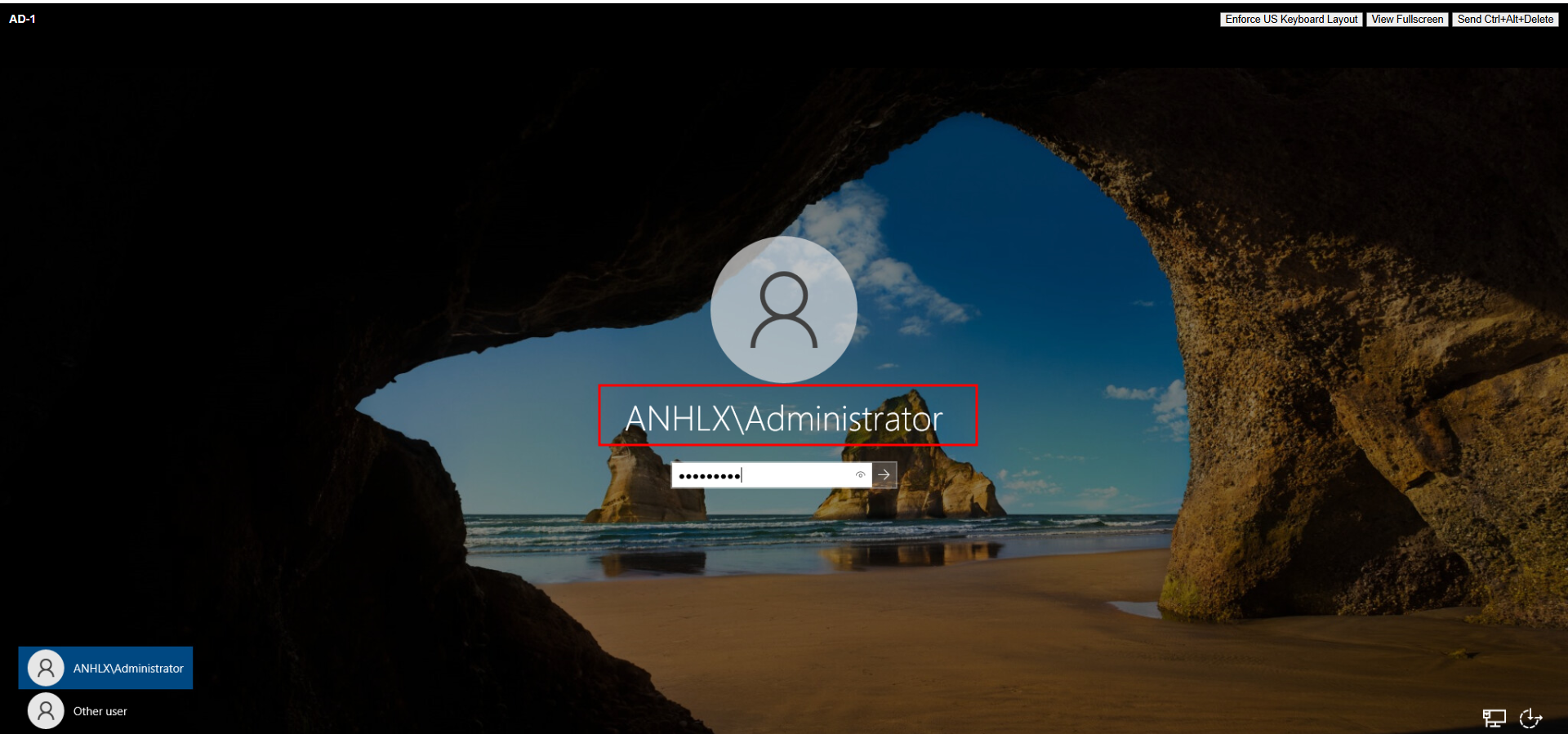 Sau khi restart, có thể đăng nhập bằng domain account: ANHLX\Administrator hoặc administrator@anhlx.lab.