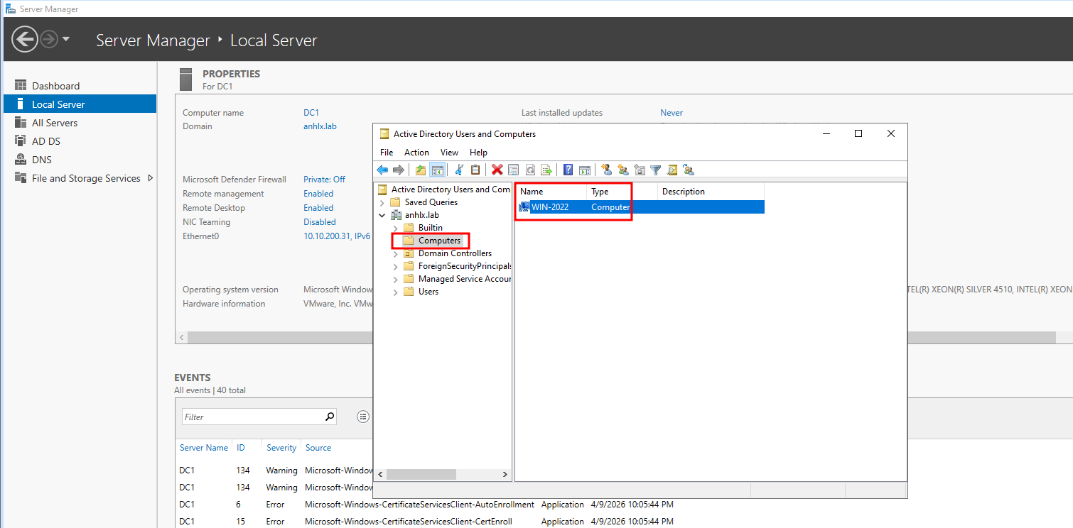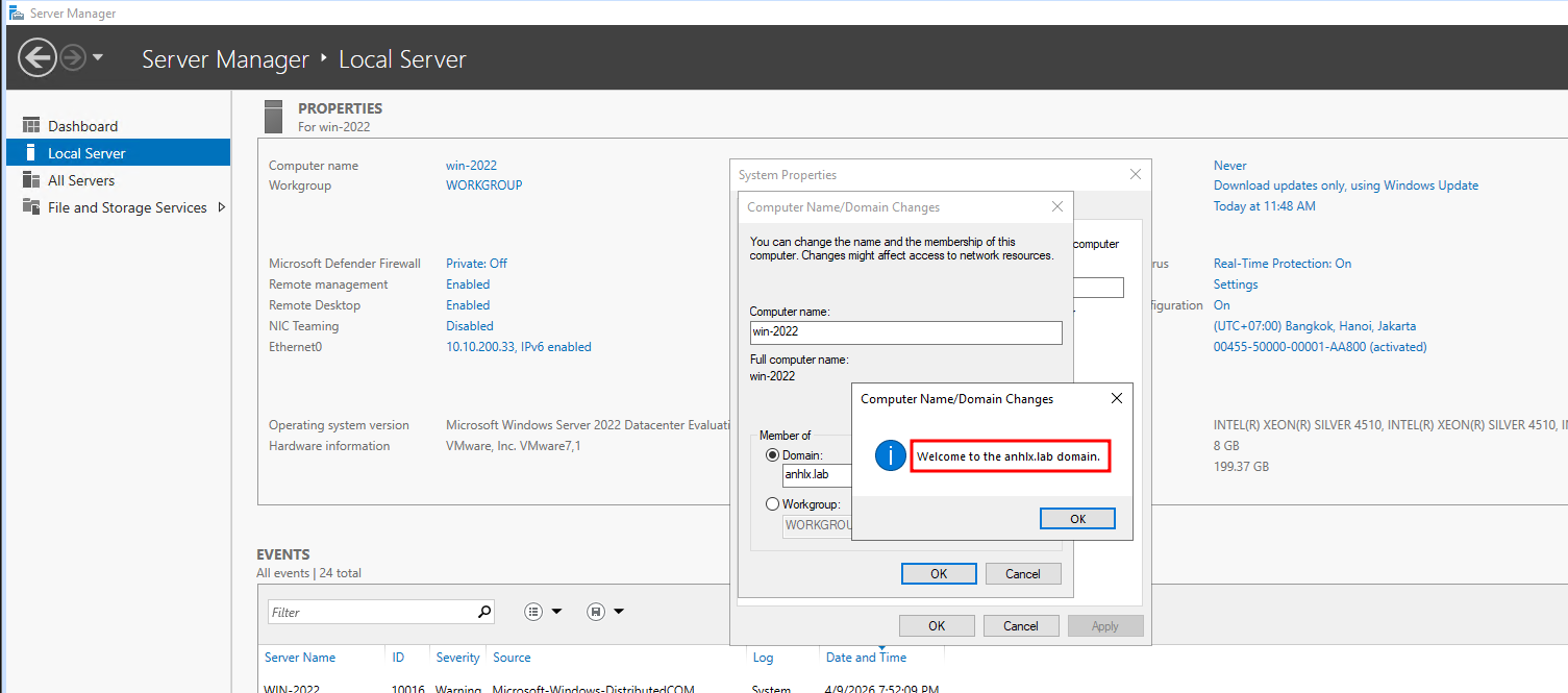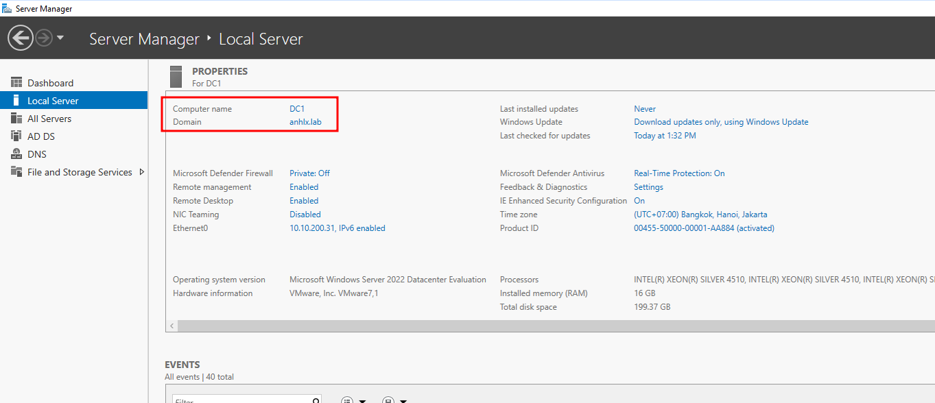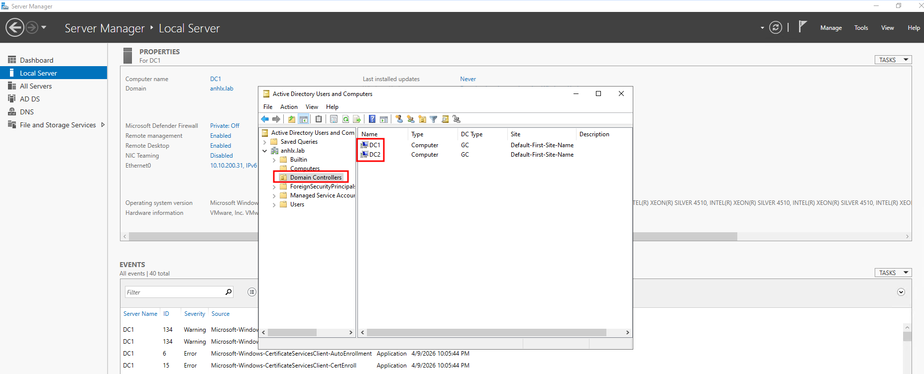 Bài viết hướng dẫn triển khai lab Active Directory Domain Services (AD DS) với 2 Domain Controller chạy Windows Server 2022 và 1 máy Windows client join domain.