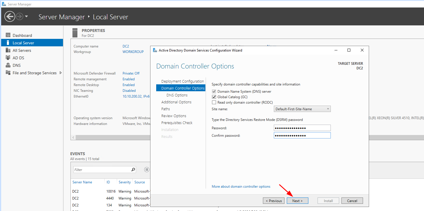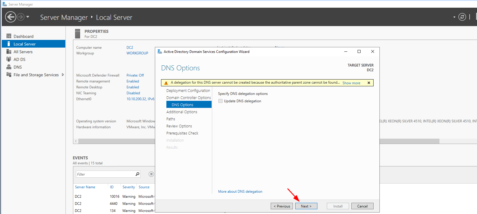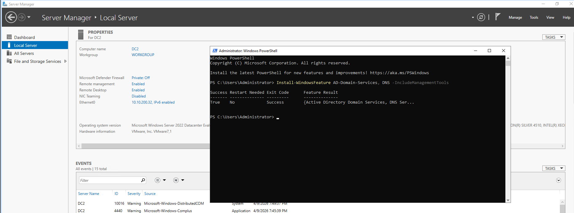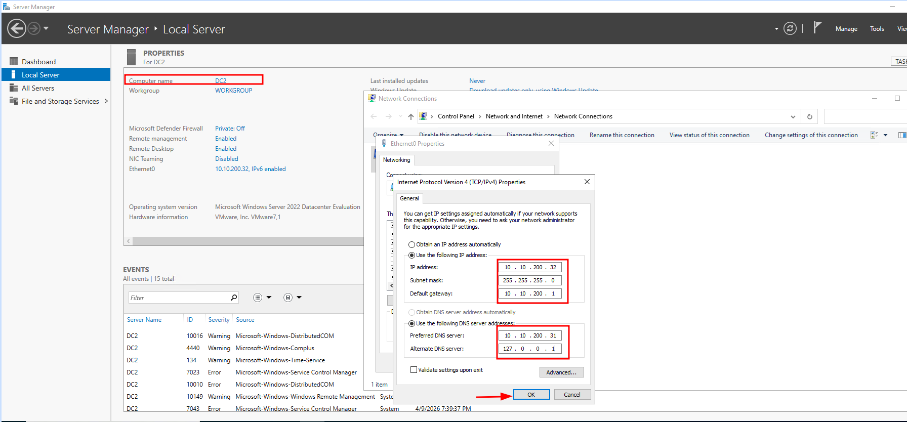 | Domain Controller 2 | DC2 | 10.10.200.32 | 255.255.255.0 | 10.10.200.1 | 10.10.200.31, 127.0.0.1 |