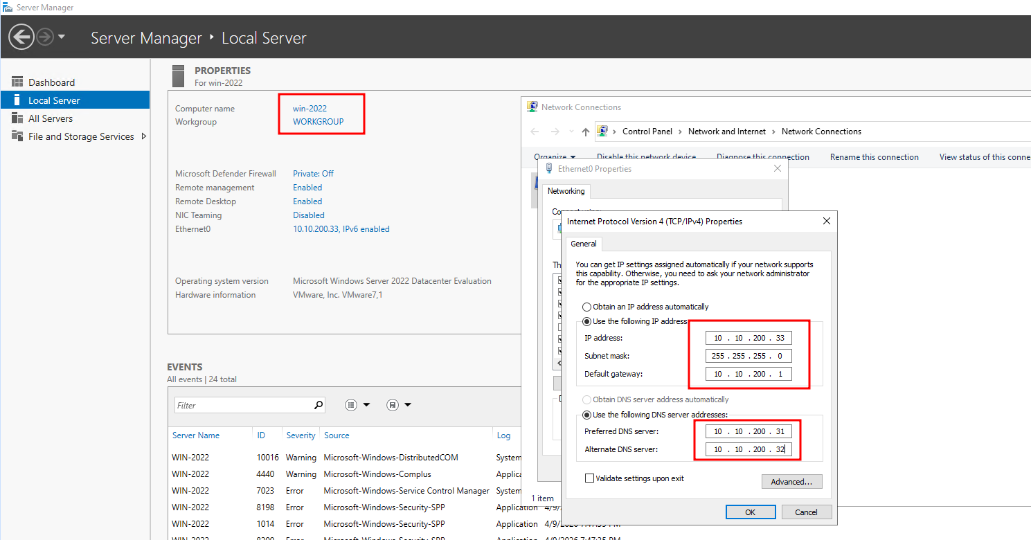 | Windows Client | win-2022 | 10.10.200.33 | 255.255.255.0 | 10.10.200.1 | 10.10.200.31, 10.10.200.32 |