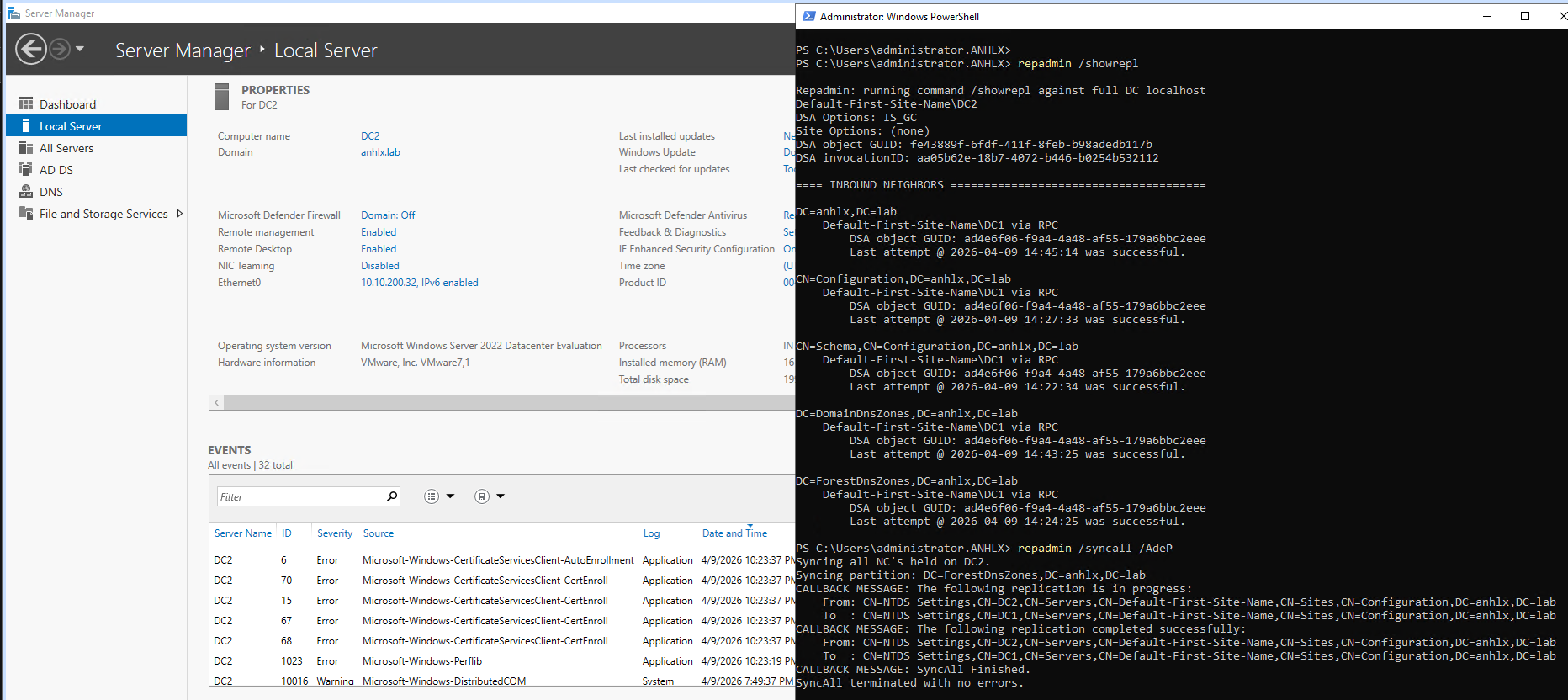 Kiểm tra replication hoạt động bình thường giữa DC1 và DC2: